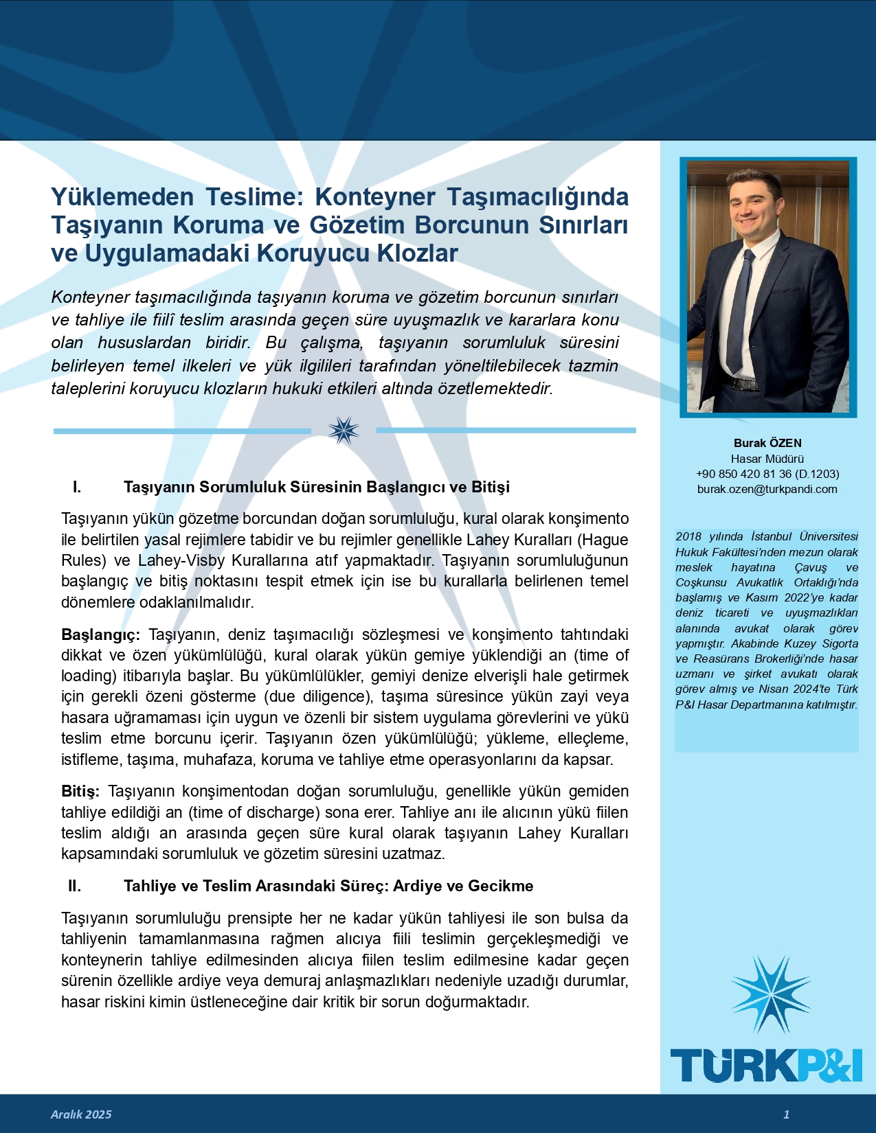 Sirküler Yüklemeden Teslime: Konteyner Taşımacılığında Taşıyanın Koruma ve Gözetim Borcunun Sınırları ve Uygulamadaki Koruyucu Klozlar Devamı için > > Hamburg Kuralları ve Deniz Sigortasına Etkileri Devamı için > > Interclub Agreement (ICA)-2025 Değişiklikleri Devamı için > > Balast Suyu Yönetimi Konulu Yoğunlaştırılmış Denetim Kampanyası (1 Eylül – 30 Kasım 2025) Devamı için > > Kurtarma Sorumluluk Ek Teminatı Devamı için > > Deniz Taşımacılığında Yaptırımların Olumsuz Etkilerinden Kaçınmak İçin Alınabilecek Önlemler Devamı için > > Yat Sigortaları Kapsamında 3. Şahıs Sorumluluk Teminatı Devamı için > > Demir Taraması: Risk Yönetimi, Önlemler ve Sigorta Kapsamı Devamı için > > Yat Sigortasında Sürat Botu Klozu ve Dikkat Edilmesi Gereken Hususlar Devamı için > > Makine Dairesi Yangınları Devamı için > > Gemi Makinelerinde Yağ Analiz Raporlarının Önemi Devamı için > > 23 Ekim 1347 - İlk Sigorta Mukavelesi ve Dünya Denizcilik Sigortaları Sektörüne Etkisi Devamı için > >